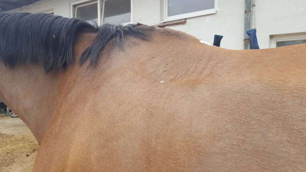 It's normal to clearly see the caudal border of the scapular cartilage in ridden horses. Most horses, especially high performing Warmbloods will have a clearly visible wither area and the caudal border of the scapular cartilage. If you are used to seeing this all the time, you might consider it to be »normal«, but the problem is that the lack of muscle in this area indicates dysfunction and/or poor saddle fit.