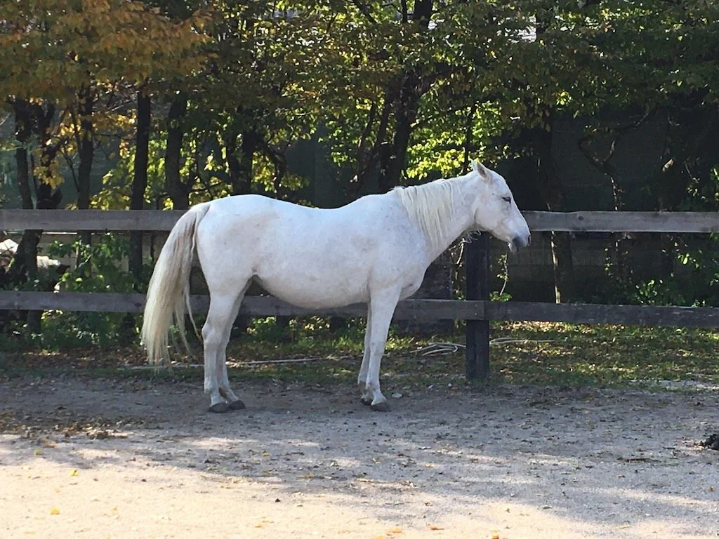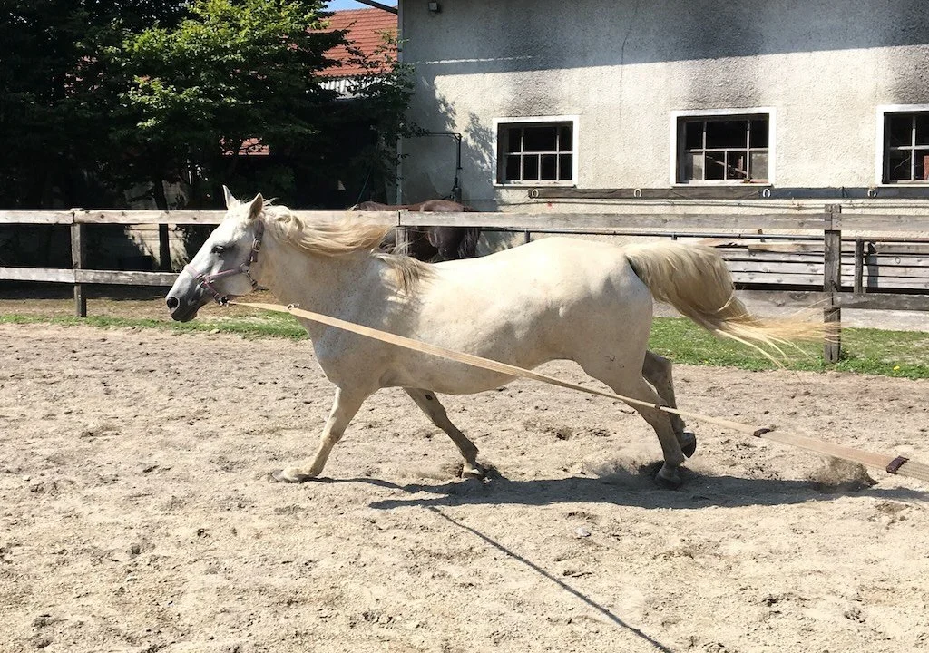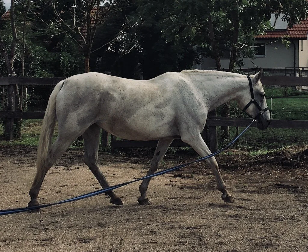 This is Nancy. When we started working with her, she was 21, fairly anxious and prone to bad posture, both in her free time as well as during work. She was one of those giraffe horses, who moved around with her head high, always on the lookout for potential threats. With steady, slow work, aimed towards developing better posture on the lunge and lots of walks out on the trail, she started to develop very nice posture. This took about 4 months. She started to look about 10 years younger. But funnily enough, this was only the case while she was moving.
